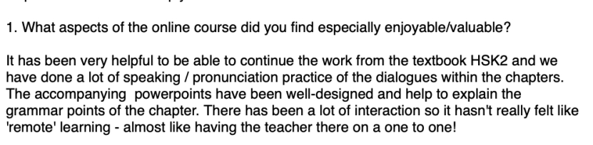 是啊,自从疫情在全球爆发起来,我们恐慌过,无奈过,我们失去了很多,但同时我们也在通过自己的努力和坚定收获着。对我来说,用我的汉语课堂帮助像Katy那样的学生实现学习汉语的需求就是收获。对我来说,疫情虽夺走了我的面授课堂,可我收获了新的网络教学技能。