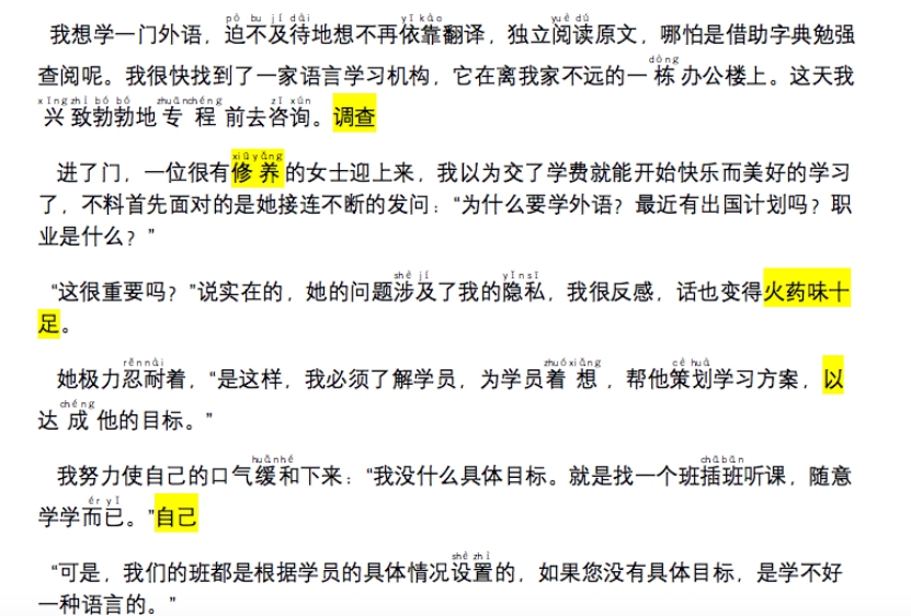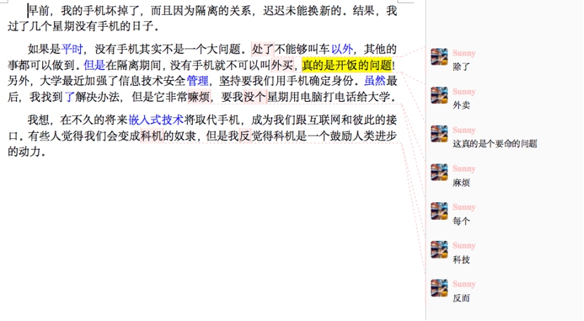 在初期以话题导向为主的口语教学阶段之后,我提出应该将重点放在他不熟悉的简体字朗读和辨识上。结合学生的学习习惯,我会在课前将阅读材料发给他,课堂时间主要用来纠音、语法语义答疑,伴以重点讲解。但是这样的课堂对于教师的专业储备和应变能力要求较高,比如K先生会询问语言学相关的知识,造字法、汉语与英语或德语(他的另一门第二语言)的区别,或者中国历史、地理等各个方面的问题。我会在不知道如何回答的时候坦诚表示下次再告诉他答案,但是这也让我平时有意识地更多地去充实自己,这也是另一种“教学相长”吧。值得一提的是,疫情开始之后我们也将一对一课程搬到了线上,没想到线上教学更适合我们的课堂练习和讲解,尤其是纠音,我可以使用在线文档直接为他读不准的字添加拼音,大大提升了我们的上课效率。请看以下例子: