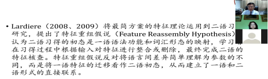 赵杨教授的讲座主要分为两部分:在第一部分的讲座中,赵教授介绍了特征重组假说(Feature Reassembly Hypothesis)基本内容及相关研究成果。赵教授结合近年来Corbett(2012)、Lardier(2008,2009)和Travis(2008)等人的研究成果阐释了特征重组假说的中心思想:二语初态是一语语法功能和词汇形态的映射,学习者在习得过程中基于输入和普遍语法对特征进行添加或删除,最终完成二语特征重组和特征核查。赵教授并进一步将之与原则假说进行区别,认为特征重组假说是特别具有解释力和预测力的二语习得假说。