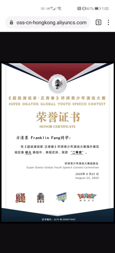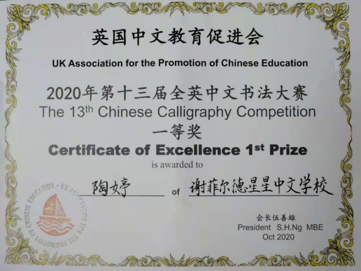 时间如白马过隙,2020年转瞬之间已到了年尾,在这个寒冷的深秋,谢大孔院接连传来了振奋人心的消息 ——谢大孔院青少年部星星中文学校的本土教师陶婷老师的书法作品,荣获2020年第十三届了全英中文书法大赛一等奖,即成年组(大楷毛笔)的第一名。谢大孔院青少年部星星中文学校的方清墨同学(7岁)荣获《超级演说家 正青春》环球青少年演说大赛海外赛区地区赛幼儿二等奖。