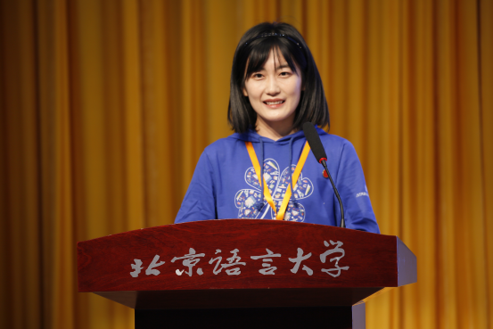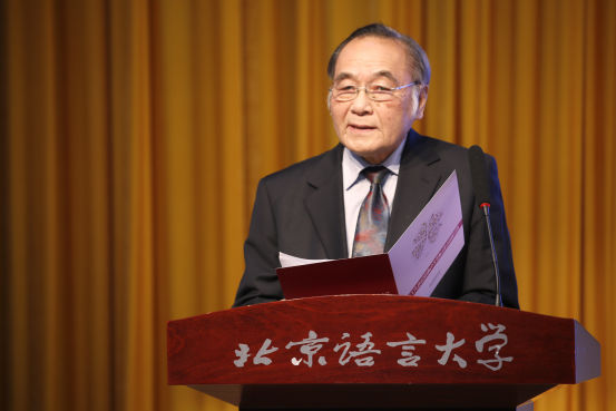 随后,中国对外汉语教学事业的先驱之一——刘珣教授走上讲台致辞。主持人介绍刘珣教授的话音未落,就收获了同学们雷鸣般的掌声。他是第一套HSK试卷的主编;他参与编写的《实用汉语课本》一直到九十年代都是世界上应用最广泛的对外汉语教材;他主编的《对外汉语教育学引论》创下了我国对外汉语教育著作“走出去”的记录。“我56年前走上讲台,45年前第一次出国教书,”刘珣教授话语殷殷,满是老一辈教育家对“后浪”的嘱托和期望:“决心投身汉语国际教育这项事业,这是非常有远见的选择,作为汉语的母语国,中国永远是国际中文教学的研究中心和基地。我们要制定最科学的汉语教学标准和规范,要拿出世界上最好的汉语教材,最适合汉语的教学理论和方法,来引领世界的中文教学。”