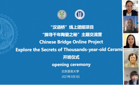 由教育部中外语言交流合作中心主办、北京语言大学承办、土耳其奥坎大学孔子学院协办的“汉语桥”线上团组“探寻千年窑烧之秘—陶瓷文化”主题交流营,于北京时间2021年3月3日-3月12日成功举办。北京语言大学孔子学院事业部副主任田鑫女士、土耳其奥坎大学孔子学院外方院长达娅·尤达库博士分别出席了开班、结业仪式。北京语言大学孔子学院事业部中国文化海外传播中心主任邱萍女士、土耳其奥坎大学孔子学院中方院长王娜娜女士,以及来自土耳其奥坎大学的宋春菊老师和奥坎大学孔子学院的师生们一起参加了本项目开班、结业仪式。