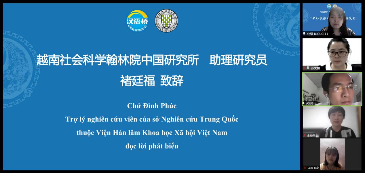 越南社会科学翰林院中国研究所助理研究员褚延福认真聆听了同学们的发言并总结到出于疫情防控的需要,我们暂时还不能像过去那样,来到中国彼此面对面相见,但是越南同学学习中文的热情以及对中国文化的热爱却并没有因此而减退,百余名同学在几天的团组活动中努力学习、认真思考,不仅使汉语水平得到了提高,更加深了对中国文化的理解,同时他也感谢北京语言大学精心策划、准备并组织了本次线上团组交流活动。