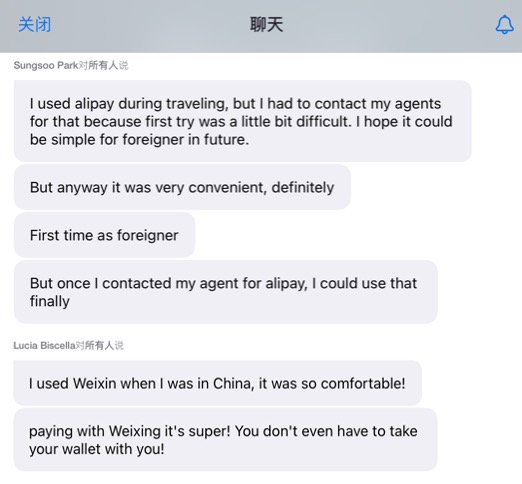 在“数字中国”课程中,小米公司的高级工程师对5G、电磁波的辐射、手机相关的黑科技以及生活中的人工智能应用等方面进行了讲解。在语言课中,学员们也对中国的手机支付方式展开了热烈的讨论。“经验贴”开始刷屏,大家纷纷介绍起了支付宝和微信的使用方法,数字化支付吸引了所有人的目光。还有学员对支付宝里的“种树”功能产生了好奇。