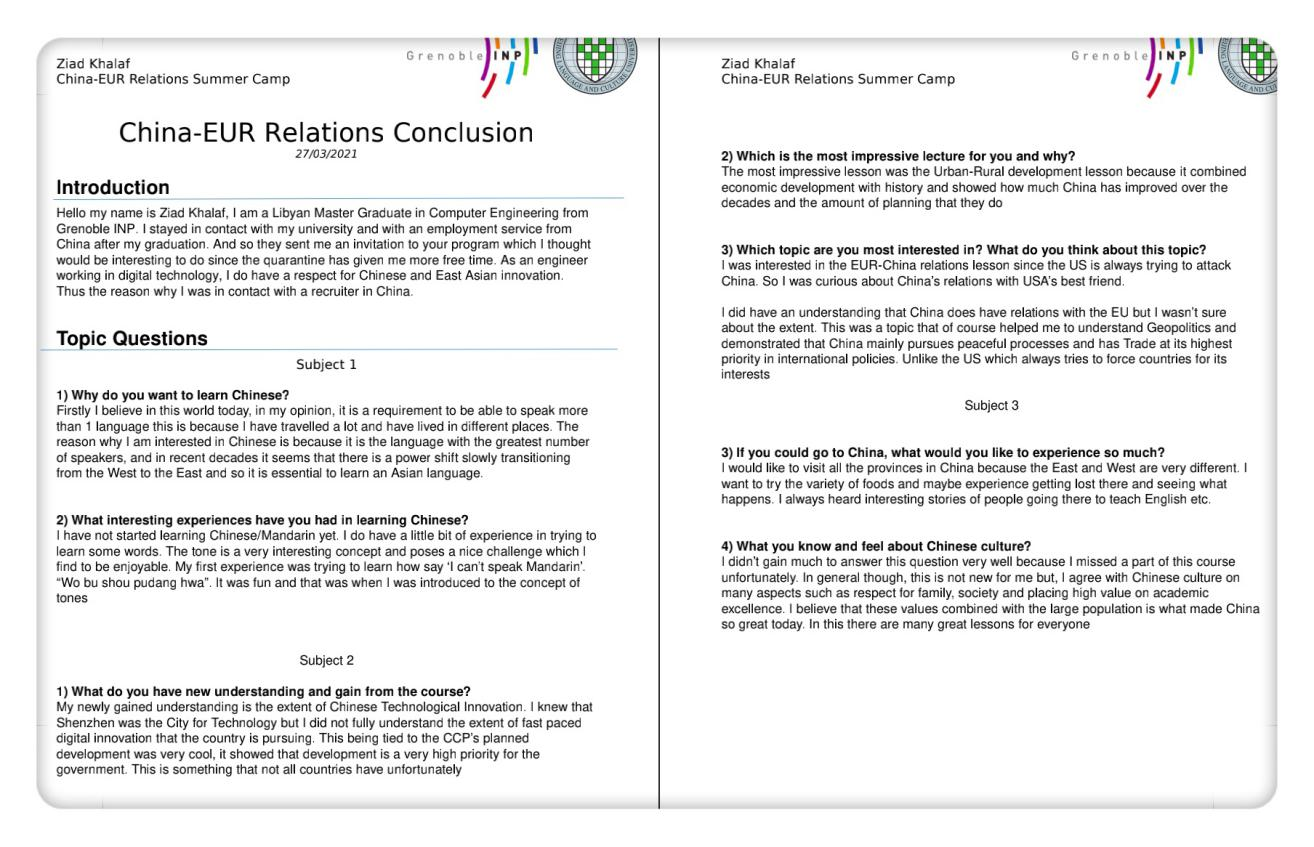 课后许多学员都对这场讲座深有感触。来自法国的电子科技工程师葛佳德(Ziad Khalaf)在课程结束后写到,“我知道中欧之间建立了伙伴关系,但我不知道其程度有多深。这个话题让我对地缘政治有了更深刻的理解,也让我对中国的和平发展政策有了认识。”