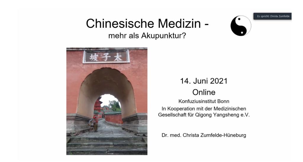 当地时间6月14日星期一18:15分波恩孔子学院携手德国气功养生医学协会共同举办了名为“中医:除了针灸还有什么?”的主题线上讲座,协会成员田丽思博士(Dr. Med. Christa Zumfeld-Hüneburg)应邀担任本次讲座主讲人,波恩孔子学院德方执行院长叶翰识博士(Dr. Hannes Jedeck)担任主持人。