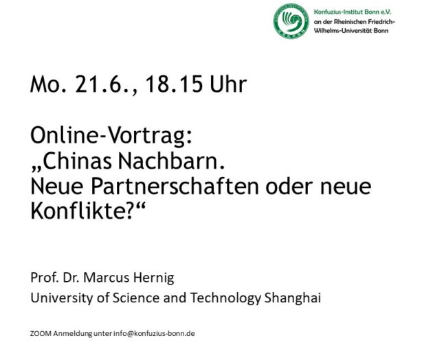 当地时间6月21日晚上18:15点,马库斯•赫尼格教授(Prof. Dr. Macus Hernig)以《中国邻国:新的伙伴关系抑或新的冲突》为题,做了一场精彩的线上报告。赫尼格教授曾经就职于上海和东京的歌德学院,目前担任文化经济咨询师,并在上海理工大学、同济大学和柏林工业大学任教。报告由波恩孔子学院德方执行院长叶翰识博士(Dr. Hannes Jedeck)主持。波恩孔院作为中德文化交流的桥梁,曾先后举办过关于中美关系、中欧关系的讲座。此次讲座吸引了四十余位听众参加。