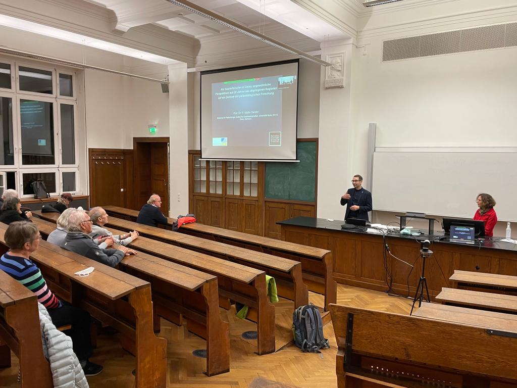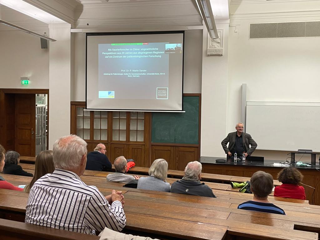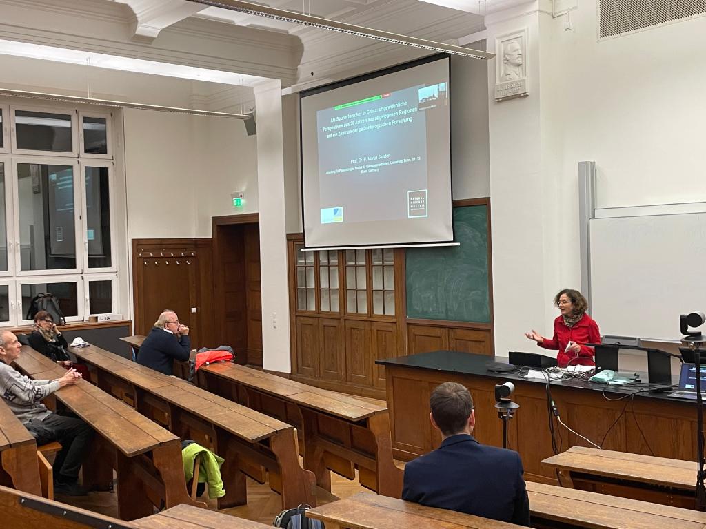 当地时间2021年11月8日晚18点,波恩孔院在波恩大学地理研究院成功举办了“探究中国,同中国一起探究”主题系列讲座之第三场讲座“德国恐龙化石研究者在中国:从罕见的视觉展示20年间在中国偏远地区的研究工作”。本次讲座由来自波恩大学地理学院的古生物研究学家马丁·桑德教授(Prof. Dr. Martin Sander)主讲。波恩大学药物化学系的克丽丝塔•穆勒教授(Prof. Dr. Christa Müller)致欢迎辞。波恩孔子学院德方执行院长叶翰识博士(Dr. Hannes Jedeck)主持本次讲座。