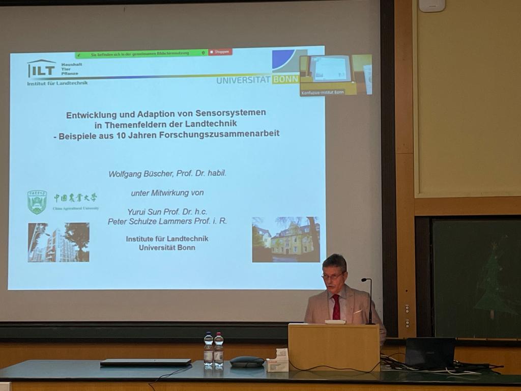 当地时间11月29日18点波恩孔院携手波恩大学农学系共同举办了“探究中国,同中国一起探究”主题系列讲座之第五场讲座“传感系统在农业技术的发展与改造——中德两国十年研究实例”。来自波恩大学农学系的沃尔夫冈·布舍尔教授(Prof. Dr. Wolfgang Büscher)应邀担任本次讲座主讲人,此次活动由同样来自波恩大学农学系的彼得•舒尔茨•拉默斯教授(Prof. Dr. Peter Schulze Lammers)致辞。波恩孔子学院德方执行院长叶翰识博士(Dr. Hannes Jedeck)担任主持人。