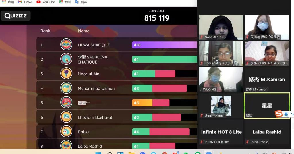 伊斯兰堡孔子学院2022虎年春节线上系列活动之“迎新春庆奥运知识竞赛”于2月8日早上9:00拉开了帷幕。本次活动用时40分钟,参赛选手们在老师们的指引下,顺利完成了紧张有序的线上竞赛。最终李莎Lilwa Shafique以满分的成绩斩获了第一名,李娜Sabreena Shafique和诺儿Noor-ul-Ain也以微小的差距分别获得了第二、第三名。知识竞赛激发了同学们对中国传统文化习俗的热爱和对北京冬奥会的更多关注。比赛后同学们意犹未尽,继续在线上热烈地讨论。