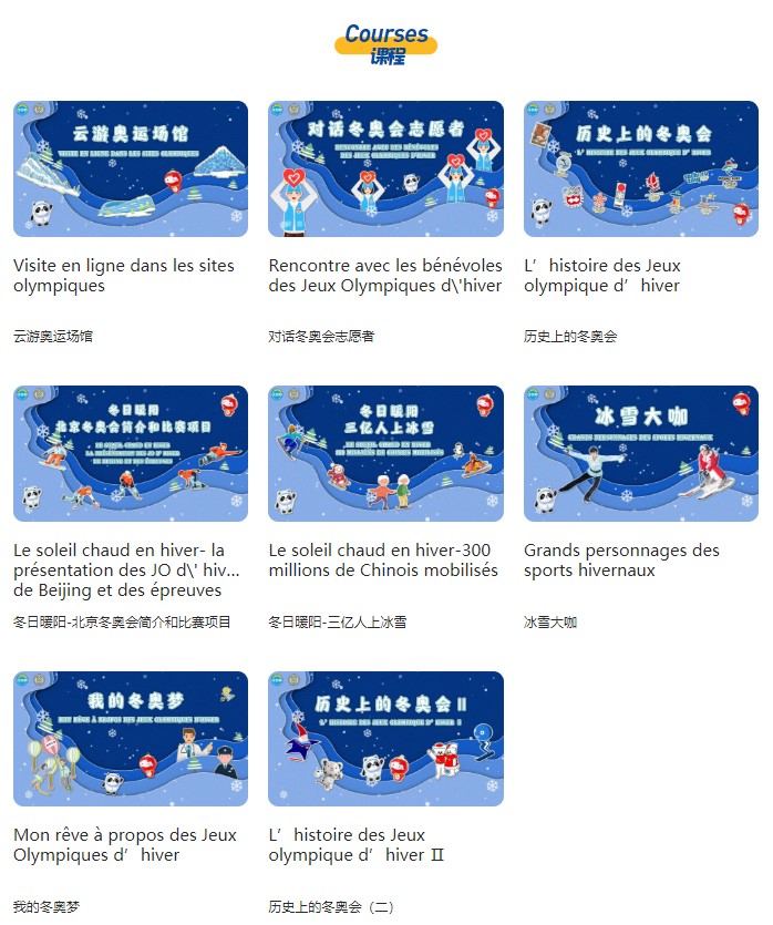 本次线上团组活动,以“中法携手 共享奥运”为主题,兼顾中文学习和文化体验,在2022年1月8日至1月23日期间开展了北京欢迎您、寻梦冰雪、中法吉祥物、云游奥运场馆、线上参观冬奥纪念品制作、冰雪大咖、听冠军的话、对话冬奥会志愿者、冬奥宣讲团、我的冬奥梦、冬日暖阳、历史上的冬奥会、你我他心相连、相约巴黎2024十四大主题的学习,充分满足了法国及法语区青少年学习汉语的热情和了解中国文化、实际体验2022年北京冬奥会的需求。