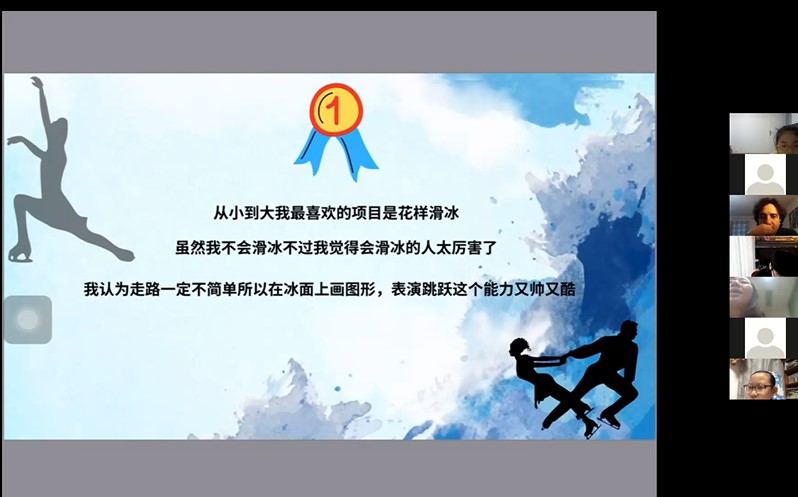 在最后一节课上,金艺天、鄂桐羽、单楚乔等同学还设计了内容充实、排版清晰的精美PPT,以我最喜欢的冰雪运动或冬奥运动员为主题进行了精彩的汇报展示。
