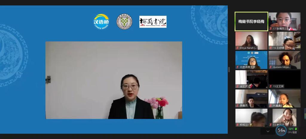 北京语言大学国际教育管理处副处长黄潇潇女士也在线上为同学们送来了祝福,她向顺利完成本次项目学习的同学们表示热烈祝贺,向大力支持本次活动的梅蘭书院以及团组的老师、管理团队表示衷心感谢。她表示,在这难忘的三周时间里,各位同学克服了时差和网络的困难,积极参与,认真学习,不仅学到了很多中文知识,体验了中华文化,还与彼此结下了深厚的友谊。最后,黄潇潇女士通过中文里的两个成语“学无止境”和“天道酬勤”提出倡议,希望同学们以此次线上中文团组为契机,继续努力学习中文,坚持下去,一定会取得更大的成绩。同时欢迎同学们疫情后来北京做客,来北京语言大学学习中文和中国文化。