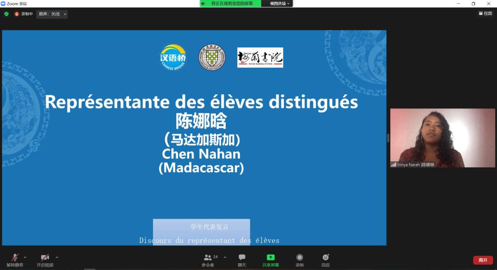 来自马达加斯加的学生代表陈娜晗在发言中对组织了本次“中法携手,共享奥运”活动的北京语言大学、梅蘭书院以及所有老师们的辛勤付出表示了感谢。她认为这次活动既妙趣横生,又意义非凡,它为参与者提供了了解2022年北京冬季奥运会和中国文化的宝贵机会。她希望所有参加“中法携手,共享奥运”活动的同学们,能够比以前更了解奥运精神、更了解中国以及中国文化。