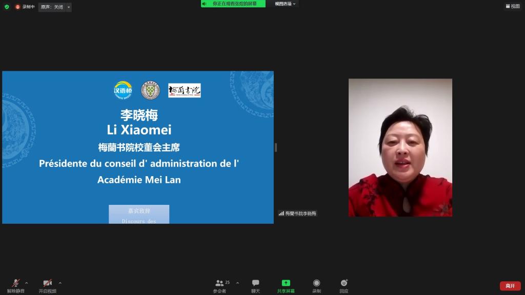 梅蘭书院校董会主席李晓梅女士在发言中表示,本次活动汇聚了法语区四十多个国家的同学,在不同时区的情况下,大家能够克服重重困难在一起学习汉语、感受冬奥会的魅力,这是非常值得赞扬的。在本次北京冬奥会中,梅蘭书院是唯一一所进入各国政府首脑驻地提供服务的文化教育服务机构。1月27号,梅蘭书院入驻冬奥会场,提供为期十天的语言服务,在这一过程中,全球的海外华文学校都可以加入到梅蘭书院的远程志愿者团队,为冬奥会提供线上语言服务。李晓梅女士称赞了团组中同学们优秀的汉语水平,并热情地为同学们提供成为冬奥会远程翻译志愿者的机会。她表示在这个过程中,大家可以更深刻地体会奥运精神,做中华文化和世界文化交流的桥梁。