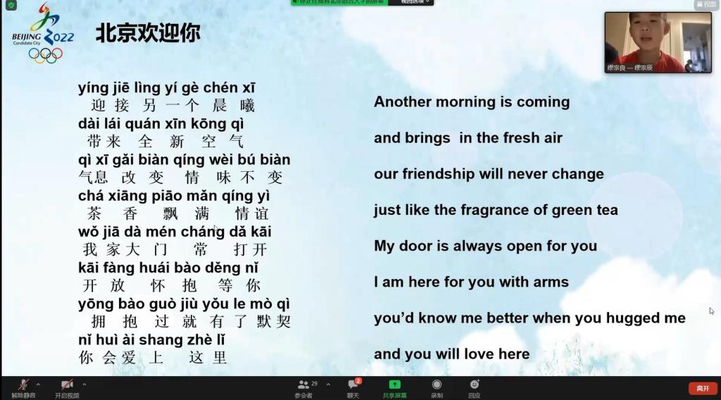 法国欧洲时报中文学校吕莹莹老师认为,能够与国内一线汉语教师互动学习,对海外青少年学生来说是非常有新鲜感的事情,能够激发学生们的学习热情。作为HSK二级成人班的汉语教师,吕莹莹老师表示在本次活动中她也受益匪浅,不光扩展了教学素材和教学场景,还延伸了教学可能。在轻松的学习氛围中,学生们既学习了汉语也了解了北京冬奥会的相关知识。同时,她也感谢本次团组的所有老师和工作人员,能够向学生们全方位地呈现出北京冬奥会的精彩和丰富。