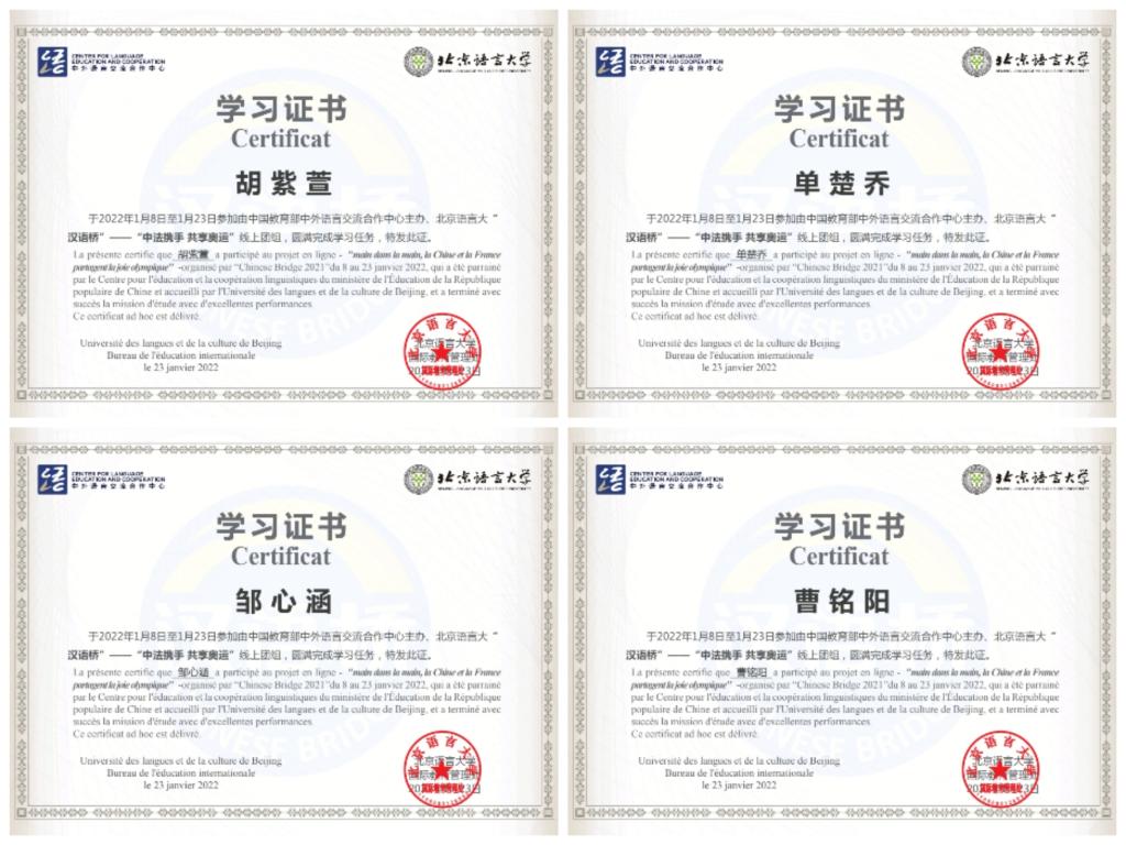 结营仪式最后,公布了本次“中法携手,贡献奥运”线上团组的优秀同学名单。同时,本次团组全体同学的优秀表现也得到了老师们的一致肯定,最终都收获了本次活动的结营证书作为纪念。