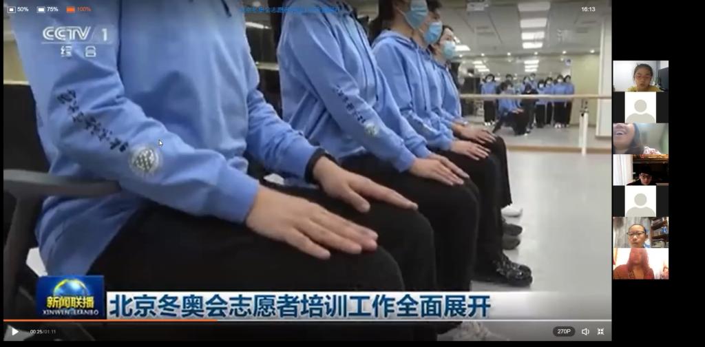 在“冬日暖阳·你我他心相连”中,同学们在教师的带领下,走进冬奥会中各高校的大学生志愿者。教师通过播放新闻短片和提问关键词的方式促进了同学们汉语听力和词汇的学习。同学们能够准确识别出短片中“志愿者”、“语言服务”、“培训”等相关汉语词汇并积极回答。