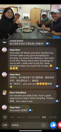 吉五青老师和麻旭老师在线教学包饺子,为学生们在线制作了水饺、蒸饺和煎饺。阿斯兰老师同声详尽解说了剁馅、拌馅、和面、擀皮儿、包饺子、煮饺子和品尝饺子等全部过程。品尝饺子的环节将此次直播活动推向了高潮,学生纷纷表示此次活动非常精彩,不仅懂得了为什么每逢过节中国人都要吃饺子,而且还可以和家人一起品尝饺子,大家在网上留言特别想吃老师做的饺子。本土阿斯兰老师也是第一次吃到了自己包的饺子,脸上洋溢着满满的成就感,老师们也觉得吃饺子的同时吃到了家的味道。