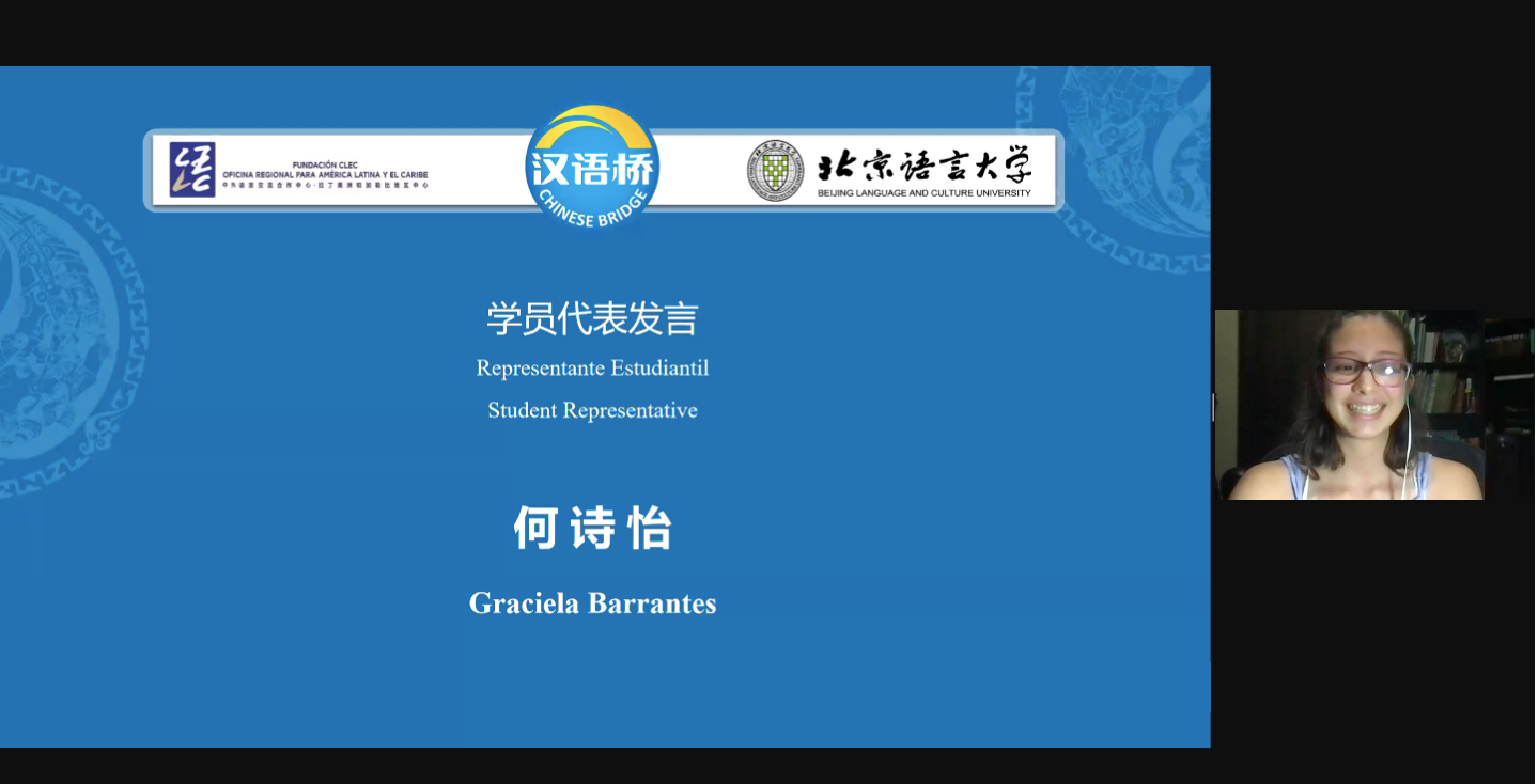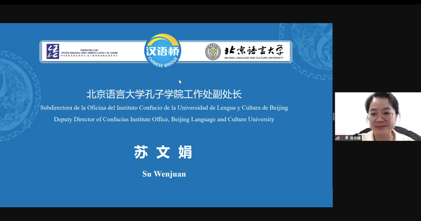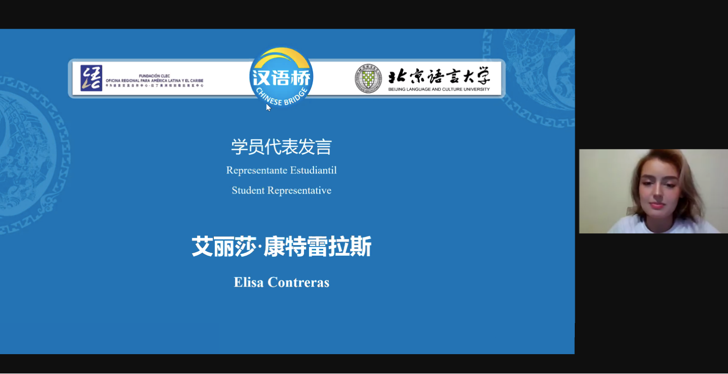北京语言大学孔子学院工作处副处长苏文娟女士在总结发言中提到,拉丁美洲-加勒比地区的120多名青少年通过这次线上活动紧紧地团结在一起令人感动,大家不仅扩大了朋友圈,还画出了最美的同心圆。她真诚地希望大家能够把在这次结下的友谊,收获的知识,以及对世界的思考延续下去,同全球各国的青少年一起,把语言和文化作为工具和桥梁,为促进各国民相亲,心相通贡献自己的力量。也希望大家能够把本次线上交流营的所见所闻,所思所想内化于心,外化于行,并在此基础上提升自己,树立平等、互鉴、对话、包容的文明观。以文明交流超越文明隔阂,以文明互鉴超越文明冲突,以文明共存超越文明优越,携手在人类共同的家园建设、和平建设、发展建设中贡献自己的力量。
