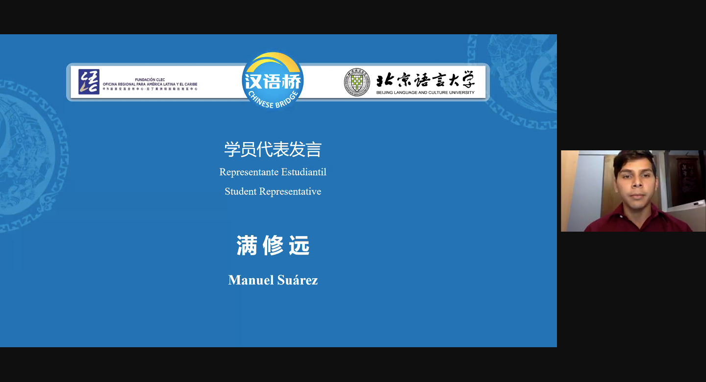 近日,由教育部中外语言交流合作中心主办,北京语言大学承办的“汉语桥”团组线上交流营——“直播中国,连线拉美” 中拉菁英青少年工作坊圆满结束。活动期间,来自阿根廷、秘鲁、玻利维亚、巴西、智利、哥伦比亚、哥斯达黎加、古巴、厄瓜多尔、萨尔瓦多、格林纳达、墨西哥、苏里南 、特立尼达和多巴哥、乌拉圭、委内瑞拉等18个拉丁美洲-加勒比地区国家的120余名学习中文,热爱中国文化的学员和北京语言大学30名在校学生相聚云端,欢聚一堂。