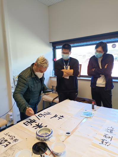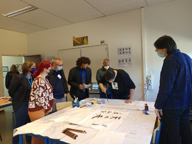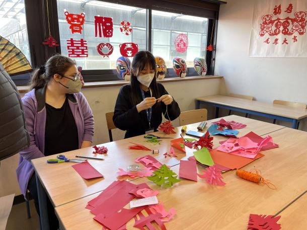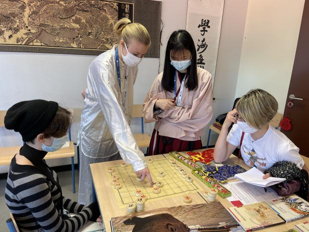 在拉罗谢尔大学国际交流中心,孔院设置了HSK考试宣讲、书法展示、剪纸手工制作和象棋游艺四个展台。许多学生和家长被汉语水平考试(HSK)的宣传片吸引,详细地询问了有关HSK考试的相关内容,对学习中文表现出了强烈的兴趣。还有的学生已经选修了高中的汉语课,这次是慕孔院之名而来,希望能在孔院师资的帮助下继续提高中文水平。孔院汉语老师和拉大中文系志愿者们热情地做了介绍并耐心地回答了问题。