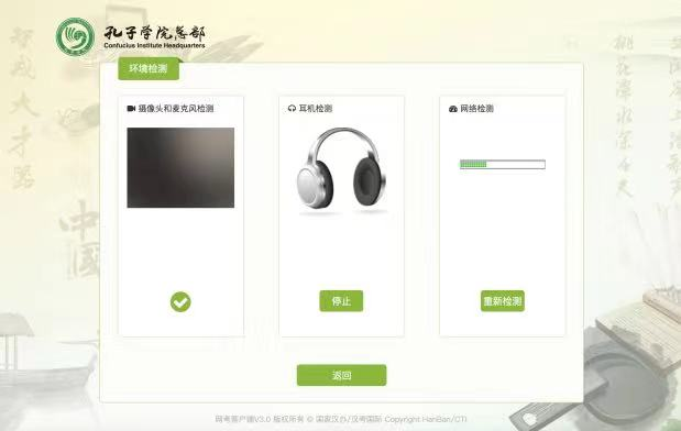 由于居家网考,客户端、人脸识别系统等对考生有不同于常规考试的要求。因此在考试前两周,孔院就已经对客户端进行了内部测试与培训:熟悉考生端系统界面,了解考试结构及考生基本操作,应对考试过程中可能出现的问题等。此外还为考生制作了报名、客户端下载、考试须知三份中英双语的指导文件,确保考生了解并及时下载以进行模拟测试。在考前一周,统一组织了考前模拟测试。