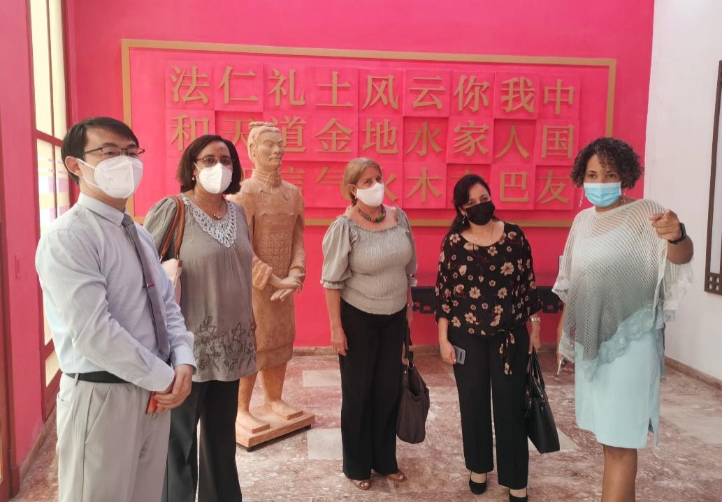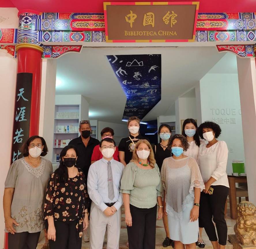 Miriam副部长热切询问了中古文化交流、古巴及其他西语国家中文教育事业的发展情况,以及在古华人华裔现状等情况。副部长表扬了中古年轻人通过各项活动提升语言能力、加强友好协作;对古巴学生申请中国奖学金的现状表示关心,希望本土教师能够得以深造,提升中文教学水平。副部长对中方教师的工作及健康状况也表示关心,对孔院工作赞赏有加,给予了充分肯定。最后,孔院教职工与莅临领导在图书馆匾额下合影留念。