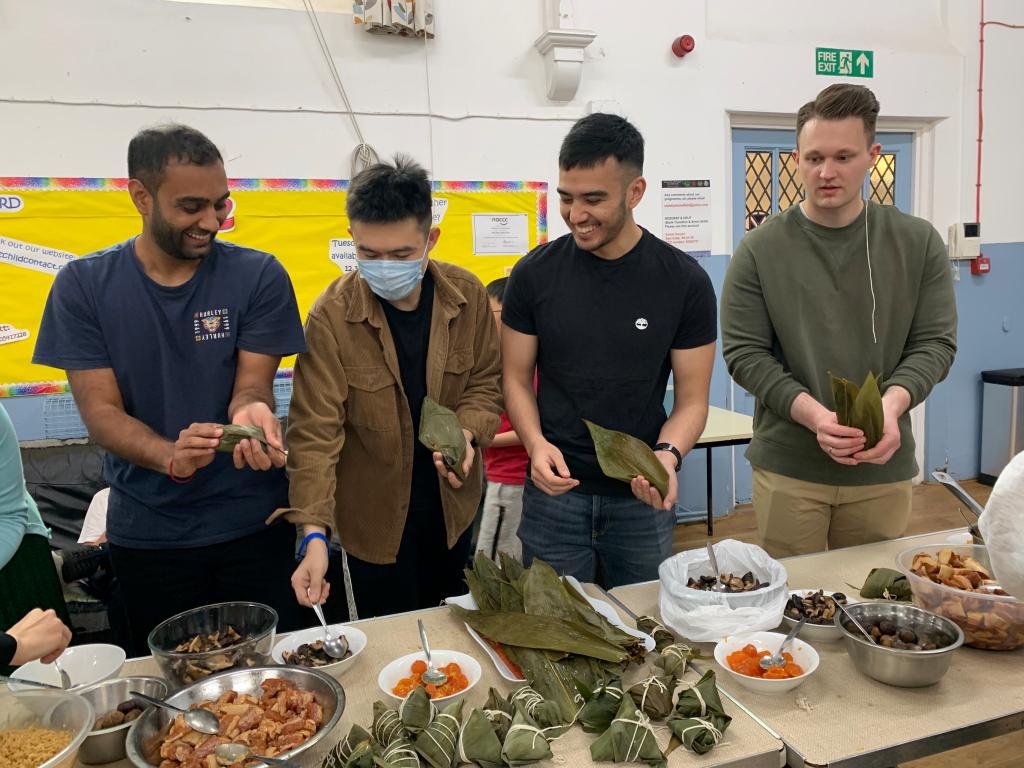 本次活动包括中英美食---粽子和蛋糕制作及品尝,以及中英节日---端午节和女王白金庆典知识问答竞猜互动等环节。为了准备这场味觉、视觉盛宴,孔院教师进行了精心准备,特别是采购各种包制粽子和烘焙蛋糕所需的食材,并在现场带领大家包粽子。当地人纷纷表示,虽然知道粽子是中国传统美食之一,但自己从未尝试,更别说亲自动手制作,每个人都跃跃欲试,场面十分热烈。在制作粽子的过程中,孔院教师详细地解释了端午节的由来,中国人民的庆祝传统以及不同地区习俗的差异。大家听得津津有味,根据老师的讲解和个人喜好制作了属于自己的专属粽子。