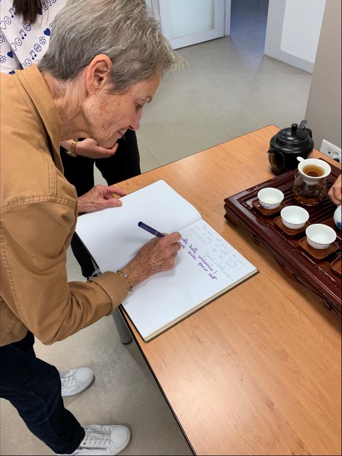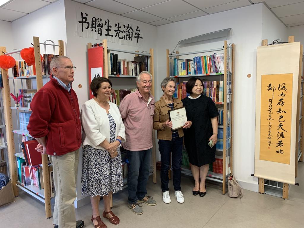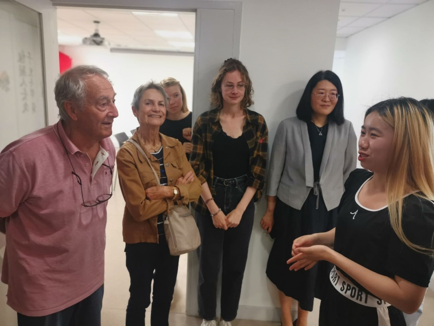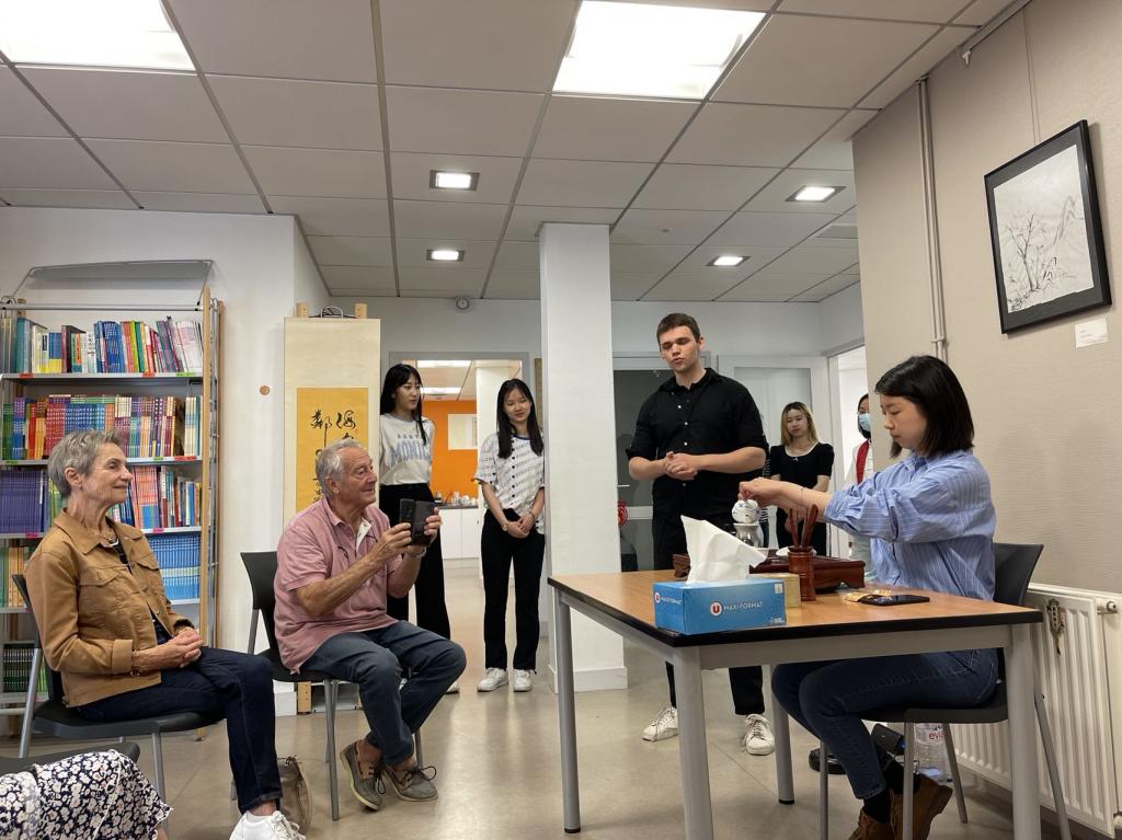 为感谢牟翰夫妇的捐赠,拉罗谢尔孔院特意组织了这次图书捐赠感谢仪式。仪式由精彩的太极扇表演拉开序幕,短短5分钟的表演,让远道而来的牟瀚夫妇在稍卸疲惫的同时,也感受到了中国传统太极文化和孔院师生的热情,两人兴致高昂地拍照录影。随后,牟瀚夫妇在孔院师生的陪同下参观了孔院的教室和活动室。