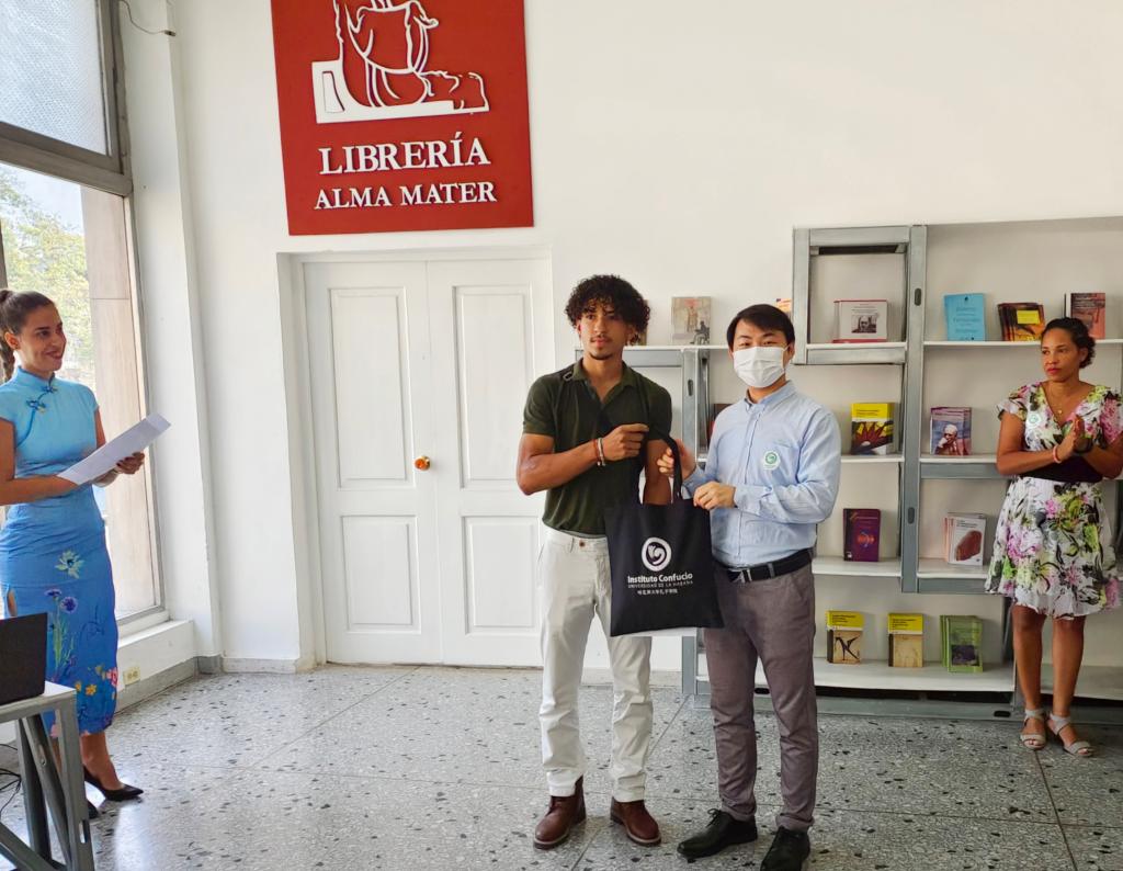 6月10日,在哈瓦那大学书店举办的传统中国画展上,哈瓦那大学孔院中古方院长为“你好中国2022”绘画比赛冠军获得者颁发奖品。“你好中国”绘画比赛由哈瓦那大学孔院组织,面向古巴所有6至17岁的儿童及青少年,线上提交一幅有关中国的绘画作品,即可参与比赛。