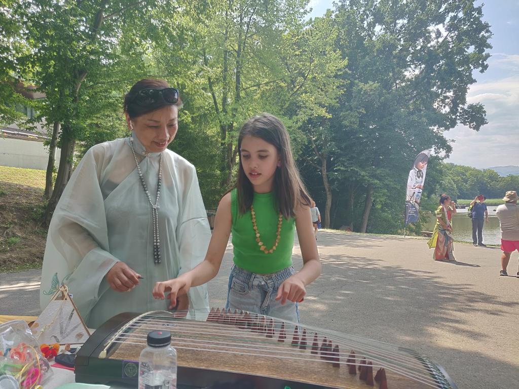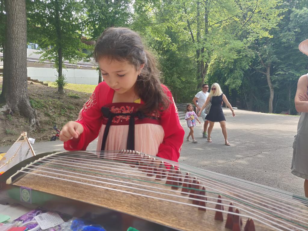 秦筝吐绝调,玉柱扬清曲。一曲《沧海笑》,一段《何须问》,一首《大鱼》,古典与现代完美结合,悠扬的乐声引来众人纷纷驻足聆听,新奇之余,赞叹不已。院长亲自上阵,摇指、勾托抹托、剔、挑等多种指法一气呵成,完全不输专业人士,夏令营期间的小营员也前来打开,喊老师“批改作业”,在志愿者老师的教学下,参与者大多能弹奏出小段乐曲,收获满满的成就感。