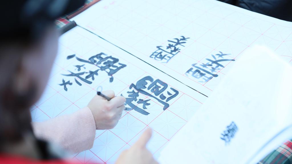 “爨”字本身意味深远,引起了这群中文学习者的浓厚兴趣。“爨”字共有30笔,发CUAN音。中国传媒大学张政法教授给同学们介绍道:兴字头,林字腰,大字下面加火烧,大火烧林,越烧越兴,岂不是很热,而爨底下村人全部姓韩,取谐音“寒”意。在中国的文化里,冷与热在五行中可以互补,有热就得有冷。同学们听完之后,开始提起笔来,尝试用毛笔写这个复杂的字。