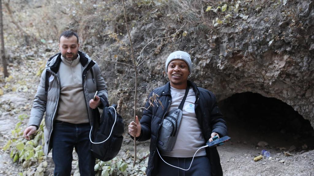 在一线天,中文导师指着同学们看堆在山底下的木棍,请大家猜测其中寓意,原来是村民用来向山神祈福的标识。德瑞同学听说后,立刻三五步登上山坡,捡起一根树枝,说我也要祈福,“我要祝福自己赚大钱,然后请大家吃饭”。一行人被他逗得哈哈大笑。