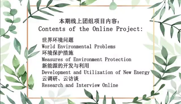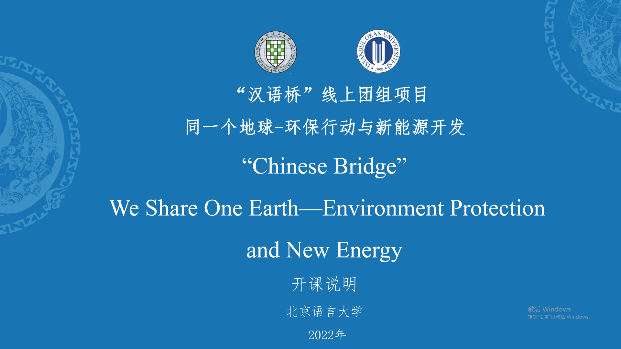 2022“同一个地球——环保行动与新能源开发”汉语桥线上团组项目旨在通过对中国环保行动与新能源开发的介绍与讲授,引导学员关注环保与新能源发展的创新与成果,增进大家学习汉语的兴趣。