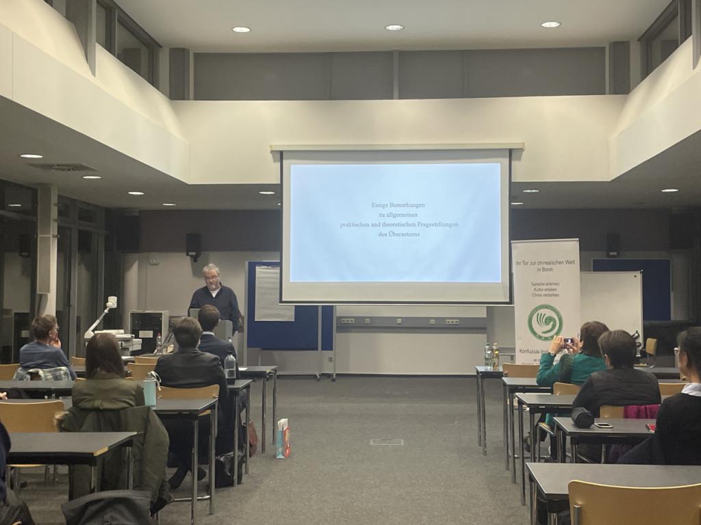 本次活动邀请到来自美因茨大学的汉斯·彼得·霍夫曼教授(Prof. Dr. Hans Peter Hoffmann)为现场观众介绍了在翻译研究和实践中的常见问题,比如:什么是翻译,如何定义翻译,翻译之后的内容究竟是原文本身就有的信息还是只是译者自己的想法,以及翻译理论和翻译实践的关系,如何将两者更好地结合起来等等。此外,霍夫曼教授还强调,要想提高翻译能力,必须通过大量阅读来提升母语水平,如此才能在翻译过程中更加得心应手。