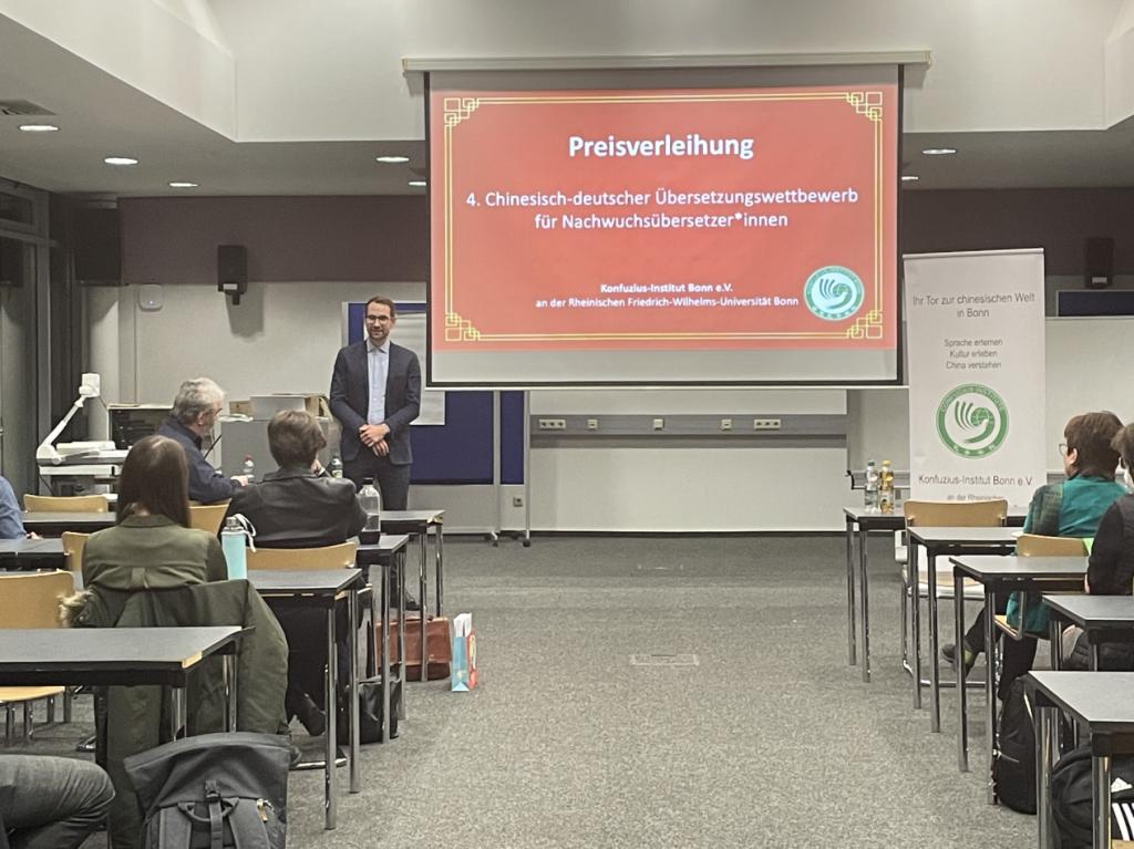 当地时间11月18号18点,波恩孔子学院在波恩大学语言中心成功举办了“第四届中德青年翻译比赛颁奖典礼”,本次活动由波恩孔子学院的德方执行院长叶翰识博士(Dr. Hannes Jedeck)主持。