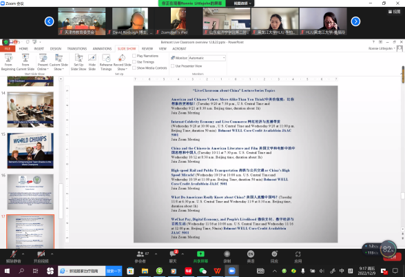 北京时间12月9日上午8时,主题为交流合作,开拓创新的中外教育交流合作项目推介会在国家会议中心309B会议室隆重召开。美国贝尔蒙特大学的张仁宁(Ronnie Littlejohn)教授应邀作为发言嘉宾,向参会的中方省厅/市教委国际合作负责人、中方学校负责人和海外学区、学校及机构负责人介绍了与北京语言大学合作开展的2022年汉语桥线上团组项目——“中国印象”中美大学生线上交流营的有关情况,得到与会人员的关注和好评,为这个中美合作的汉语桥项目画上了圆满的句号。
