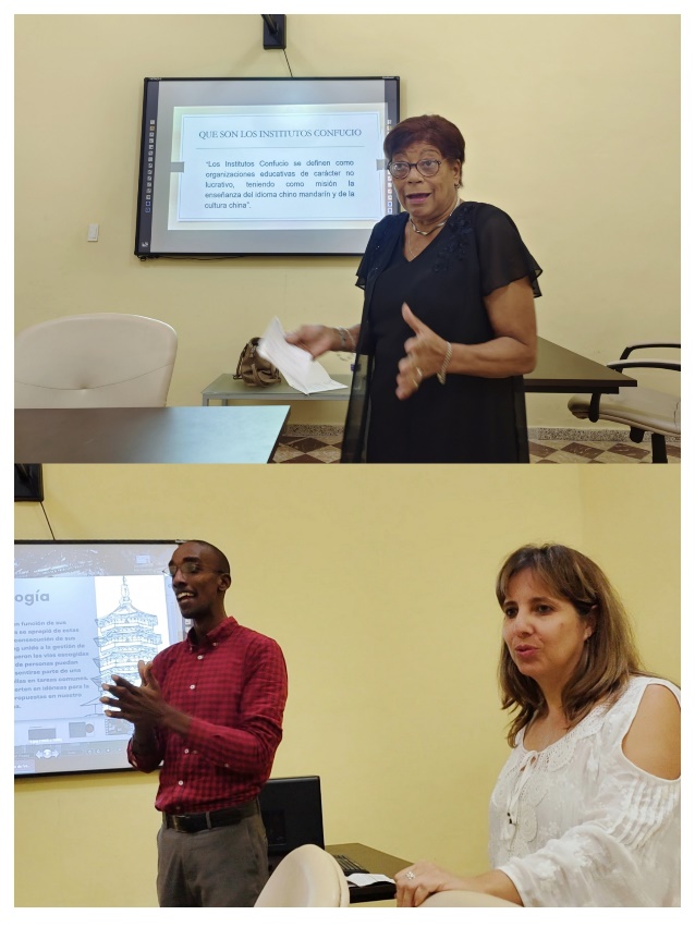 11月24日上午,哈瓦那大学孔院古方院长Yorbelis Rosell León向参会来宾详细介绍了孔院发展与现状。中方院长丁汀分享了孔院立足“中文+职业技能”这一教育趋势开展的一系列探索,着重介绍了孔院在“中文+旅游”领域取得的良好成果,希望为古巴培养更多优秀的复合型人才。