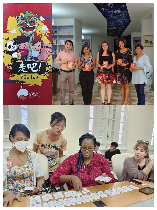 随后,三位智利学者Mariana Osorio、Andrea Mella和Karina Piña共同分享了汉字卡牌游戏“走吧!”的使用经验。这是一种从观察、关联和演绎三个角度切入,通过词根或字符联想汉字,进而推断其字义的汉字游戏。三位学者现场组织大家一起做游戏,都亲自体验了“走吧!”的实用性与趣味性,是汉字教学一种很有效的练习方式。会后还向孔院赠送了几副汉字卡牌,提供给更多的古巴学生体验,帮助他们通过游戏提升汉字认读能力。
