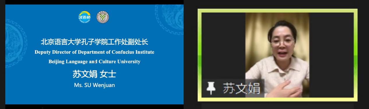 北京时间12月11日,由教育部中外语言交流合作中心主办、北京语言大学承办的2022年汉语桥“中国速度,物流生活”主题学习营顺利开营,北京语言大学孔子学院工作处副处长苏文娟、伊朗伊斯法罕大学中文系主任雷凡(Arian Ahmadreza)、伊朗德黑兰大学助理教授巴阿明(Amin Bazrafshan)与来自伊朗德黑兰大学、伊斯法罕大学、阿拉梅·塔巴塔巴伊大学的140多名营员参加仪式。