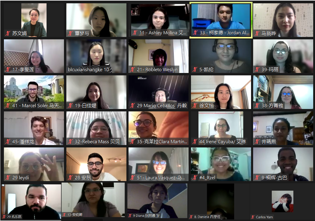 北京时间12月12日,由教育部中外语言交流合作中心主办、北京语言大学承办的2022年汉语桥“中拉友好交流合作面面观”线上团组顺利开营,北京语言大学孔子学院工作处副处长苏文娟、各班级语言课教师、班主任与来自墨西哥、哥斯达黎加、尼加拉瓜、秘鲁、古巴、哥伦比亚、萨尔瓦多、多米尼加、智利、厄瓜多尔、委内瑞拉、美国等12个国家的140多名学员参加活动。