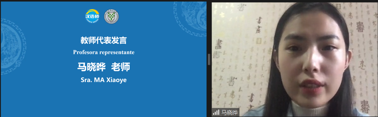 教师代表马晓晔在发言中说,期待通过汉语课立体生动地展示一个真实、亲切、友好的中国,并帮助学员们用语言表达自我,让老师和学员成为彼此了解对方文化的一扇窗,并通过这扇窗去领略不曾见过的美丽风景。