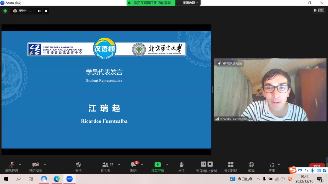 来自3班的学员代表江瑞起同学表示,非常感谢北京语言大学,让学员们有机会,与不同国家的同学一起学习中国绘画知识,用中文进行交流。在过去的两个星期中,他们不仅学到了宫廷画、民俗画等不同题材的绘画,而且在交流中锻炼了的中文,收获很多。