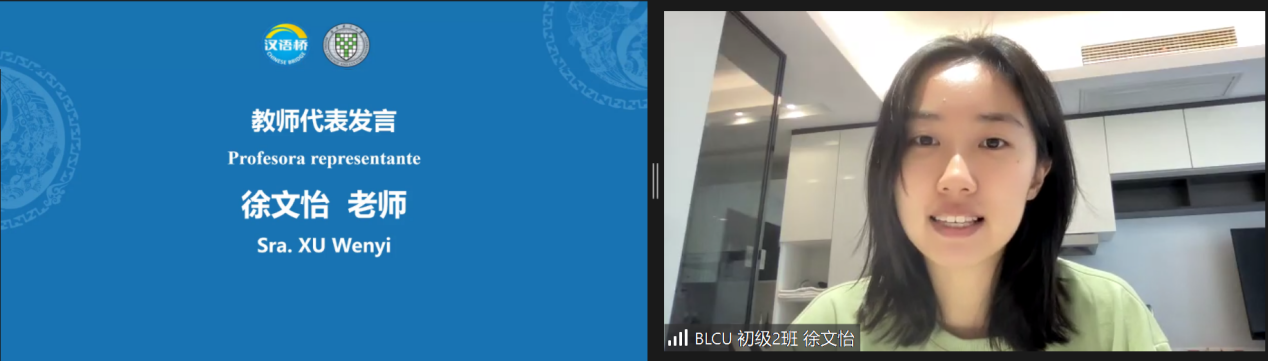 教师代表徐文怡在发言中说,学员们一起学习了长城、美食、手工艺、手机购物等文化现象和相关的语言点,进行了有趣、有用的汉语学习体验。在学习过程中,学员们表现良好,祝愿汉语学习为学员们创造更多的发展机会。
