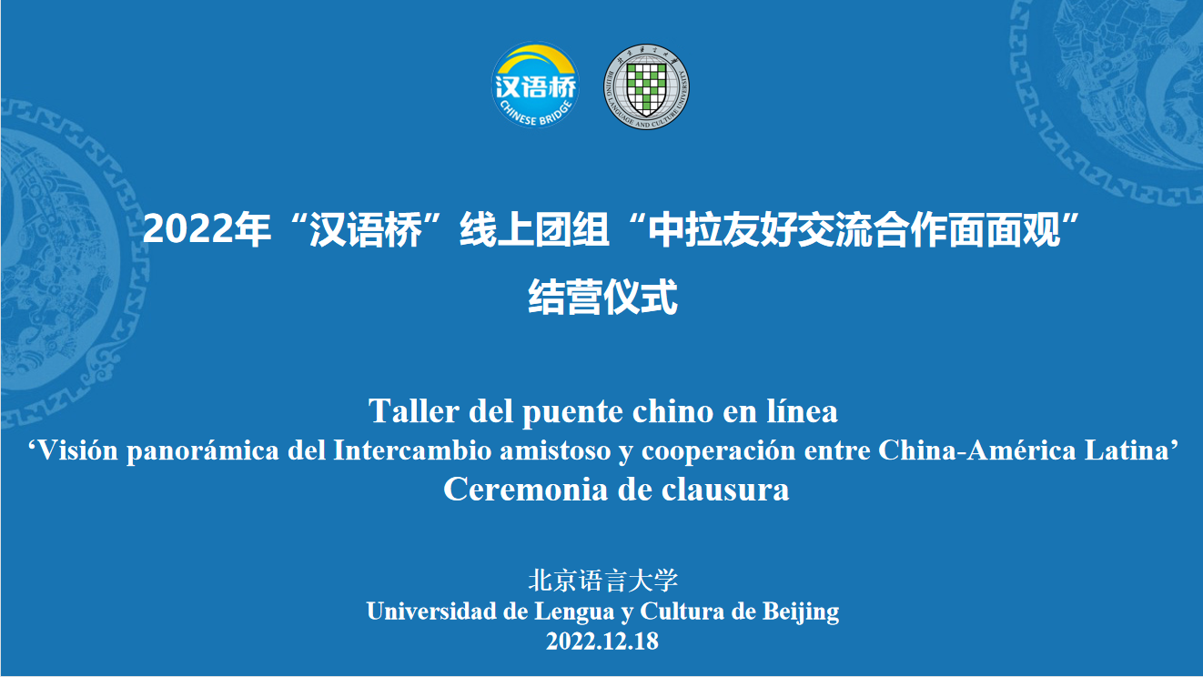 北京时间12月18日,由教育部中外语言交流合作中心主办、北京语言大学承办的2022年“中拉友好交流合作面面观”汉语桥线上团组圆满落下帷幕。交流营的教师代表、班主任和来自墨西哥、哥斯达黎加、尼加拉瓜、秘鲁、古巴、哥伦比亚、萨尔瓦多、多米尼加、智利、厄瓜多尔、委内瑞拉、美国等12个国家的140多名学员参加了结营仪式。
