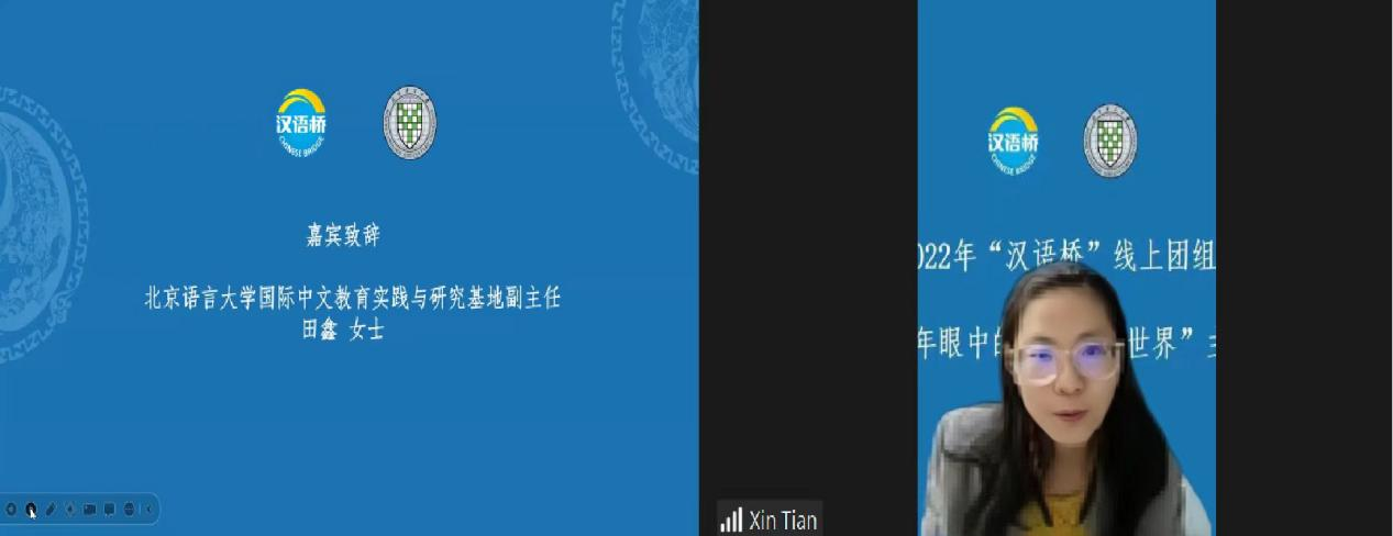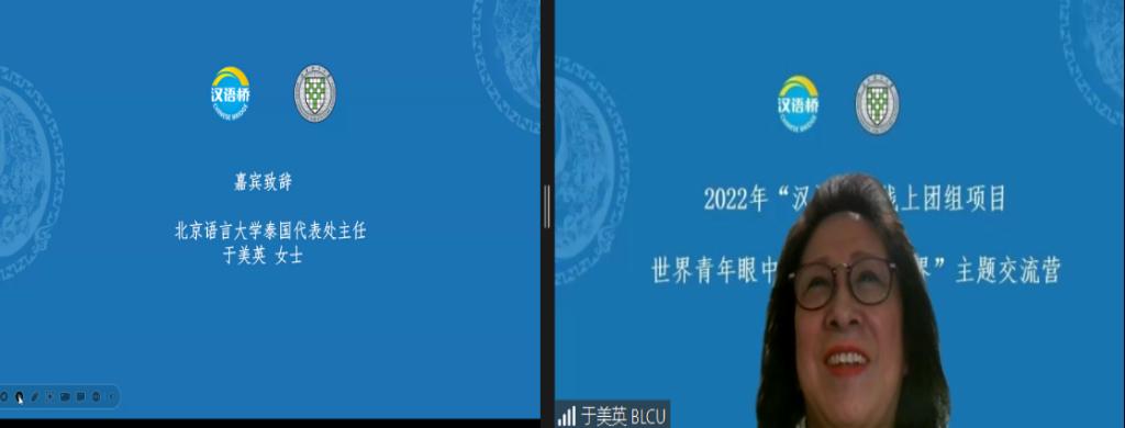 北京时间12月22日19点,2022年“汉语桥”线上团组项目—世界青年眼中的“中国与世界”主题交流学习营开班仪式在线上顺利举行。本项目由教育部中外语言交流合作中心主办,北京语言大学承办,设有专题研讨、学术视野、青年圆桌会、青年之声等模块,以直播课程、录播课程、线上体验、实时互动等学习形式为来自越南、伊朗、巴基斯坦、泰国、墨西哥、土耳其等国家的356名学员提供交流与学习平台。北京语言大学国际关系学院院长贾烈英、国际中文教育实践与研究基地副主任田鑫和北京语言大学泰国代表处主任于美英出席并致辞。