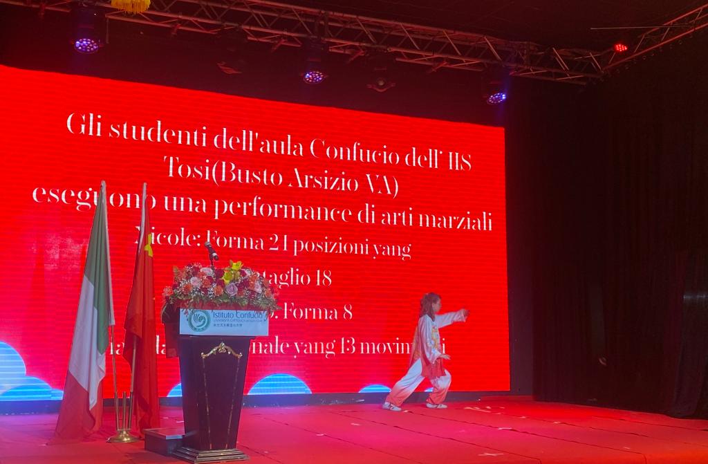 一开场,托西中学孔子课堂的学生Nicole Baroncelli和Stefano Baroncelli带来了一段太极和武术表演,赢得了满堂喝彩。