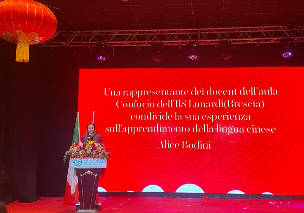 孔院下属的伦纳迪中学孔子课堂汉语教师Alice Bodini用中意双语深情讲述了自己与汉语结缘的故事。她曾是该孔子课堂的一名高中学生,因为学习了汉语,对中国文化产生了浓厚的兴趣。后来她经孔院推荐获得了奖学金,有机会去中国深造。她毕业后选择了回母校教中文,带领更多的学生走入汉语和中国文化的殿堂。她十分感谢当年孔院为她打开了一扇认识中国的窗口,为众多像她这样的中国语言文化爱好者搭建了一座桥梁。