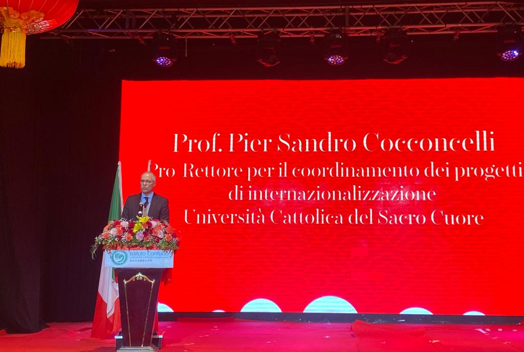 接下来,圣心大学副校长高科切利教授在致辞中表示,通过视频介绍,孔院十三年来在各个方面的持续发展历历在目,这是北京语言大学和圣心大学精诚合作的成果。近三年来,全球遭遇了前所未有的困难和危机,这些危机不仅让教育工作者反思目前的教学方式,也对国际合作和不同文明的互相交流提出了新的挑战。在这种情况下,孔院的工作显得尤为重要,正如一进门时孔院宣传牌上所写的“链接中国”。这是本次活动的意义所在,也是圣心大学一直致力的目标。最后他也为嘉宾们送上了新春的祝福。
